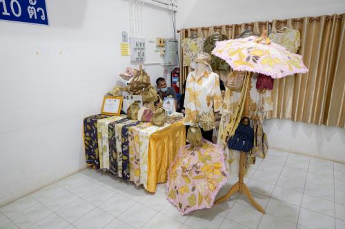 🪸ทั้งนี้ กลุ่มวิสาหกิจชุมชนกลุ่มผลิตภัณฑ์ตัดเย็บจากผ้า ตำบลสนามคลี อำเภอบางกระทุ่ม นำ "ผ้าพิมพ์ลายธรรมชาติ Eco print" มีทั้งเสื้อ หมวก กระเป๋าถือ กระเป๋าคล้องมือ และร่ม ซึ่งเป็นผลิตภัณฑ์ OTOP 5 ดาว มาจัดแสดงและจำหน่ายในกับผู้เข้าร่วมการประชุมในครั้งนี้